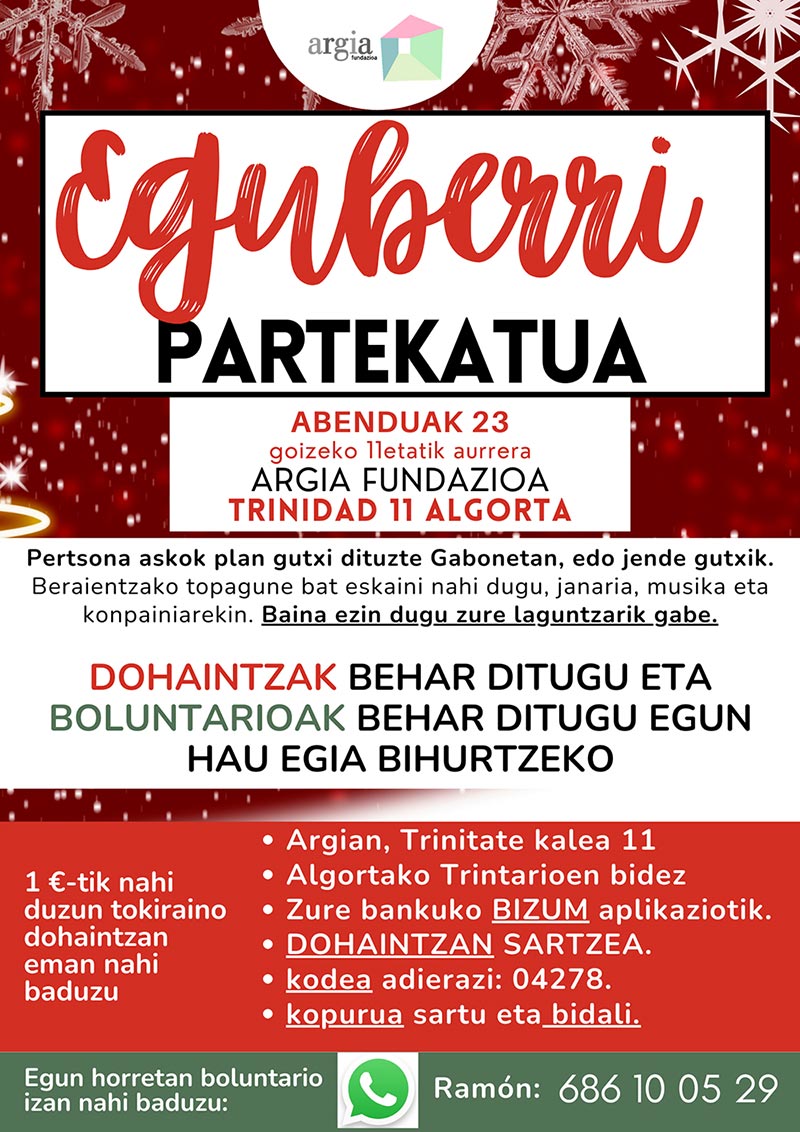 Bigarren urtez jarraian, Argia Fundaziotik, Getxo Udalarekin batera, GABONAK PARTEKATUTA ekimena abiarazi genuen. Pertsona, erakunde eta negozioak gonbidatzen ditugu GABONAK PARTEKATUTA ekimenean laguntzera. Abenduaren 22an, igandea, ospatuko den proiektu honen helburua da egoera ezberdinetan dauden 100 pertsona biltzea egun berezi batez gozatzeko, konpainiaz, jarduerez, emanaldiez eta menu berezi batez.